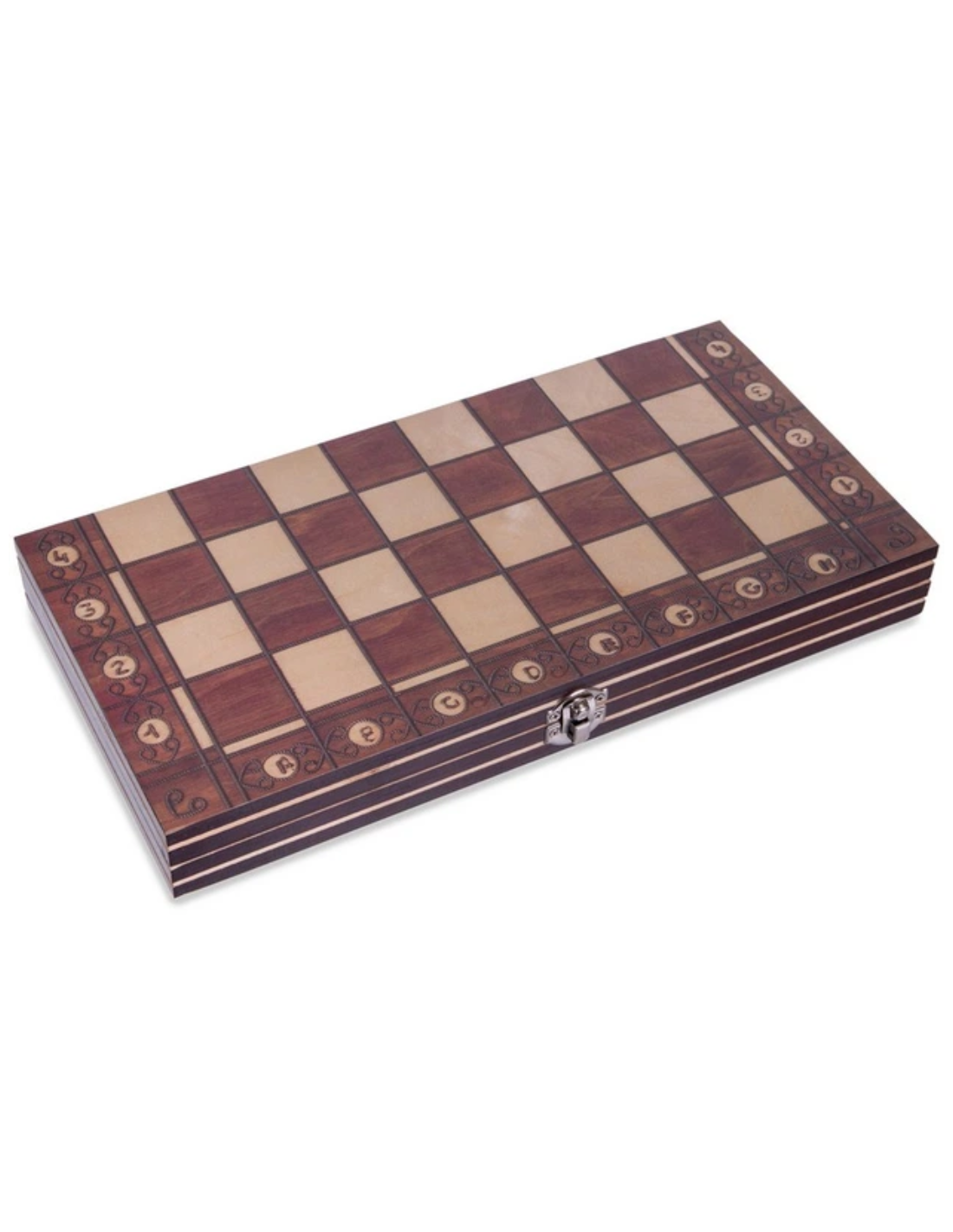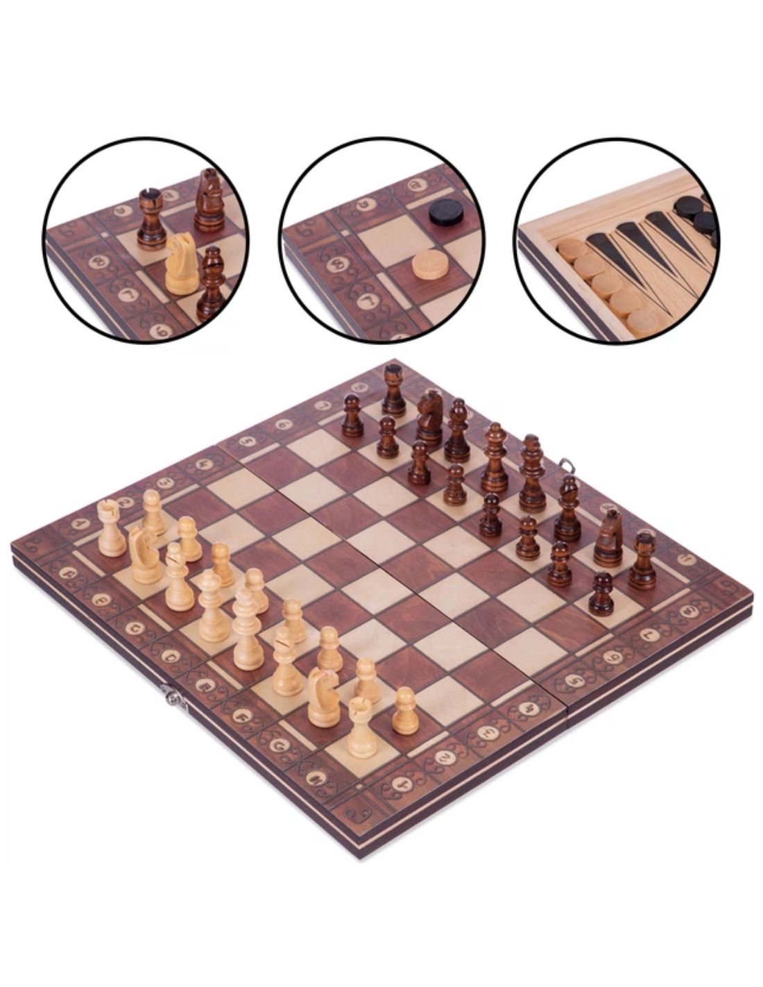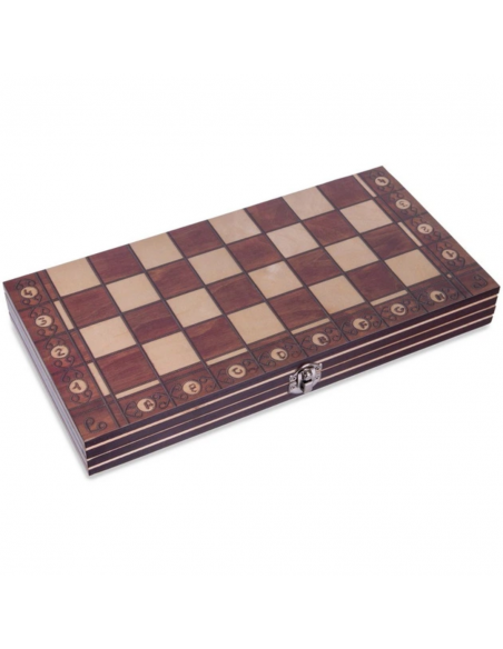 Qutu yüksək keyfiyyətli ağacdan hazırlanmışdır və təsadüfən açılmanın və fiqurların itirilməsinin qarşısını alan etibarlı kilidlə təchiz olunub. Daxili hissə nərd üçün oyun sahəsi kimi işarələnib, xarici hissəsi isə nazik metal lövhə ilə örtülərək şahmat lövhəsi formasında dizayn edilib. Şahmat fiqurlarının içərisinə maqnitlər yerləşdirilib ki, bu da səfər zamanı sarsıntı olsa belə onların aşmasının qarşısını alır. Fiqurlar və dama daşları möhkəm ağacdan hazırlanır — ağ fiqurlar üçün açıq, qara fiqurlar üçün tünd ağacdan istifadə olunub və rəngsiz lakla örtülərək dəstin ümumi zərifliyini vurğulayır. Dəstə nərd oyunu üçün plastik zər kubları da daxildir.