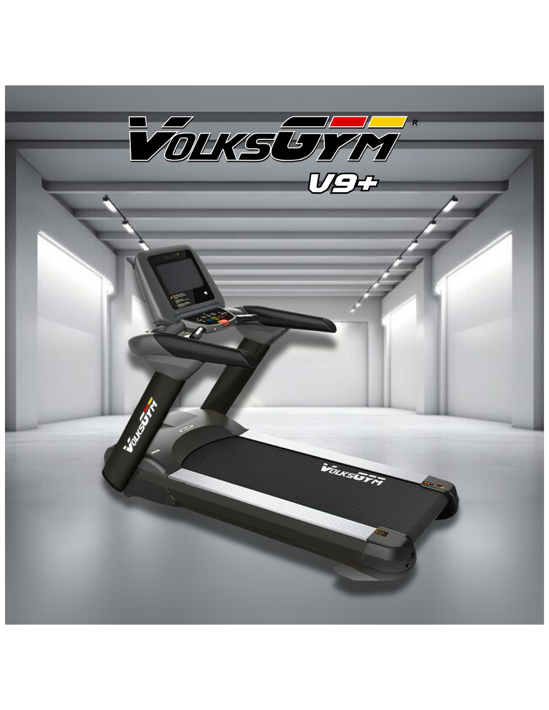 The Volksgym V9+ treadmill is ideal for both home and professional use, featuring a powerful motor and a wide running surface.