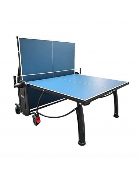 Теннисный стол предназначен для использования в помещении. На столе лежат 3 мяча и 2 ракетки.